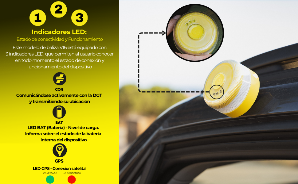 - Alta visibilidad: La luz de emergencia V16 homologada DGT cuenta con potentes luces LED visibles hasta 1 km y en 360 grados, asegurando máxima visibilidad tanto de día como de noche. Esto ayuda a mejorar tu seguridad en caso de avería o accidente al llamar la atención de otros conductores.